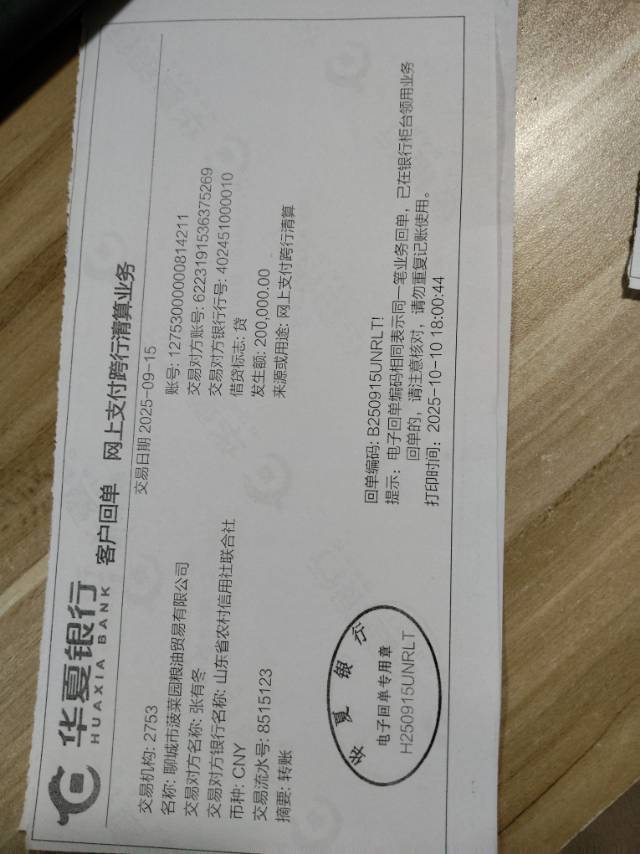 这张单据是华夏银行的网上支付跨行清算业务回单,显示你公司向“山东省农村信用社联合社”支付了20万元,用途为“网上支付跨行清算”,属于银行转账付款。