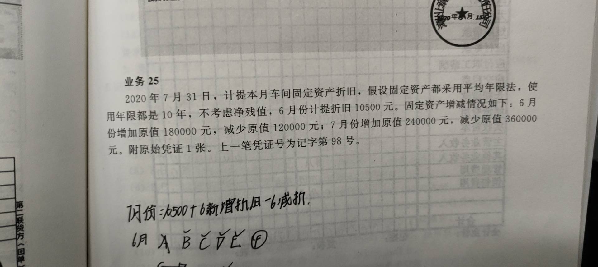- 增加原值240,000元(从7月起计提折旧)→ 本月折旧:240,000 ÷ 120 = 2,000元