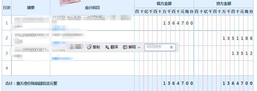 - 第一张图:借方金额1364700,贷方无红字,未体现冲销,不完整。