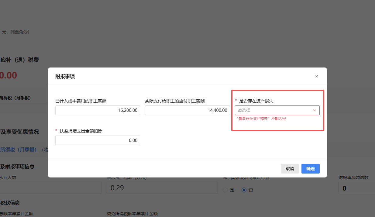 “是否存在资产损失”是企业所得税季度申报中的附报事项,需根据企业当季是否发生资产损失(如固定资产报废、坏账、存货毁损等)进行选择。 - 若当季有资产损失且已做税务处理,选“是”; - 若无资产损失或未申报,选“否”。 此选项用于判断企业是否需填报《资产损失税前扣除及纳税调整明细表》(A105100),与实际会计核算和税务处理挂钩。
