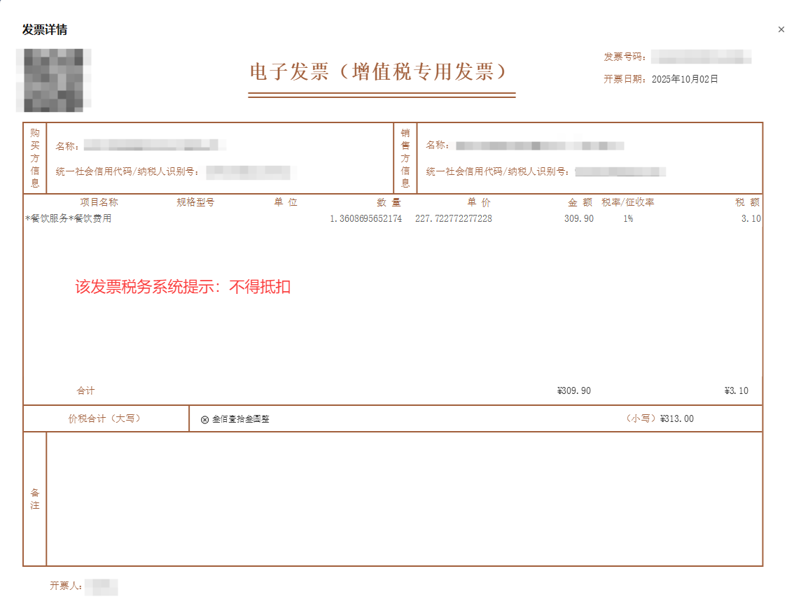 该发票因涉及“餐饮服务”项目,且开票日期在2025年12月31日前,根据增值税政策规定,不得抵扣进项税额。 但可以作为合法费用凭证入账,计入“管理费用-业务招待费”等科目,只是不能用于抵扣增值税。 若需抵扣,可要求对方红冲后重新开具其他可抵扣项目的发票(如办公用品、差旅费等)。 建议:先确认是否必要抵扣,若无需抵扣,直接做费用处理即可;若需抵扣,则让对方红冲重开。