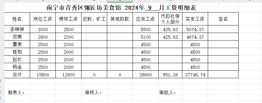老师您好!请根据这张工资表帮我写一下计提工资和发放工资的分录,用银行支付的工资,谢谢了