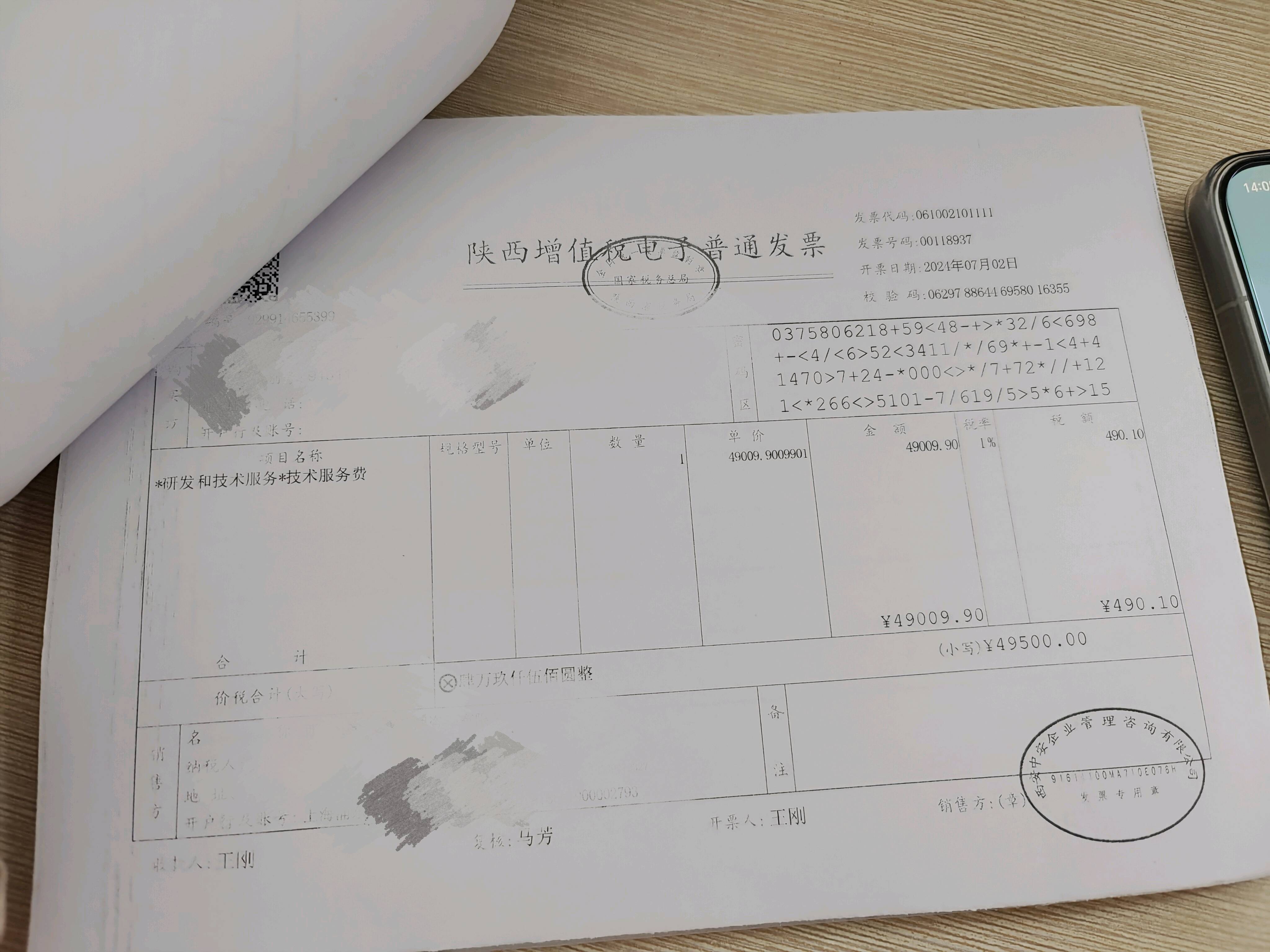1. 借:管理费用——技术服务费 49,009.90