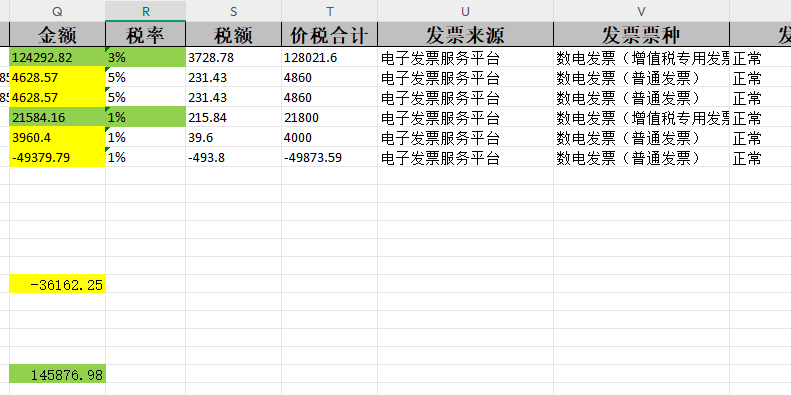 - 1%税率的普票(如21,584.16、3,960.4)也归入对应税率栏。
