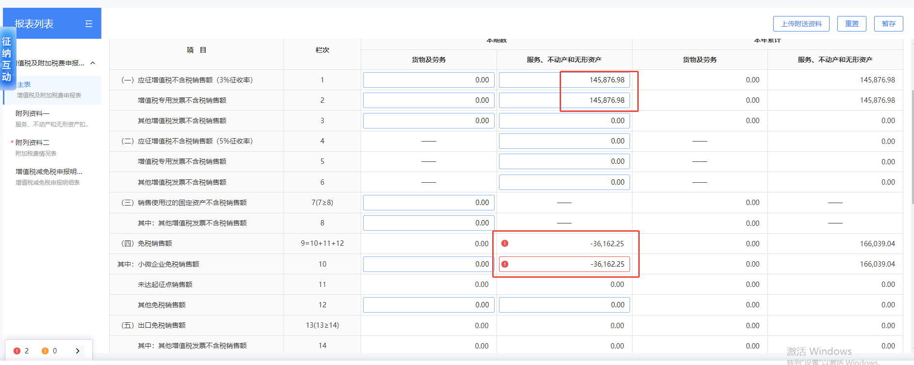 - 确保“应征销售额”合计为正数(如145,876.98),而“免销额”为负值(-36,162.25),系统会自动计算应纳税额。