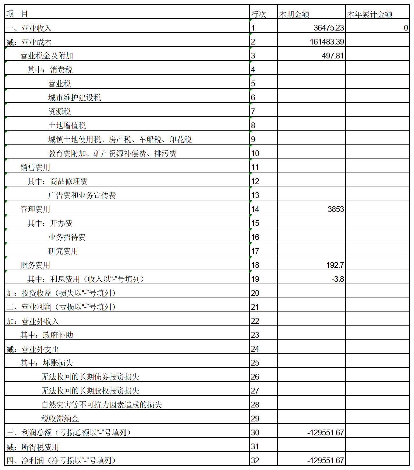 1. 利润表中净利润为 -129,551.67,但公司刚成立,无实际经营收入,不应出现如此大额亏损。