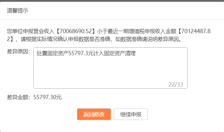 - 点击【继续申报】,说明差异原因即可,不需修改;