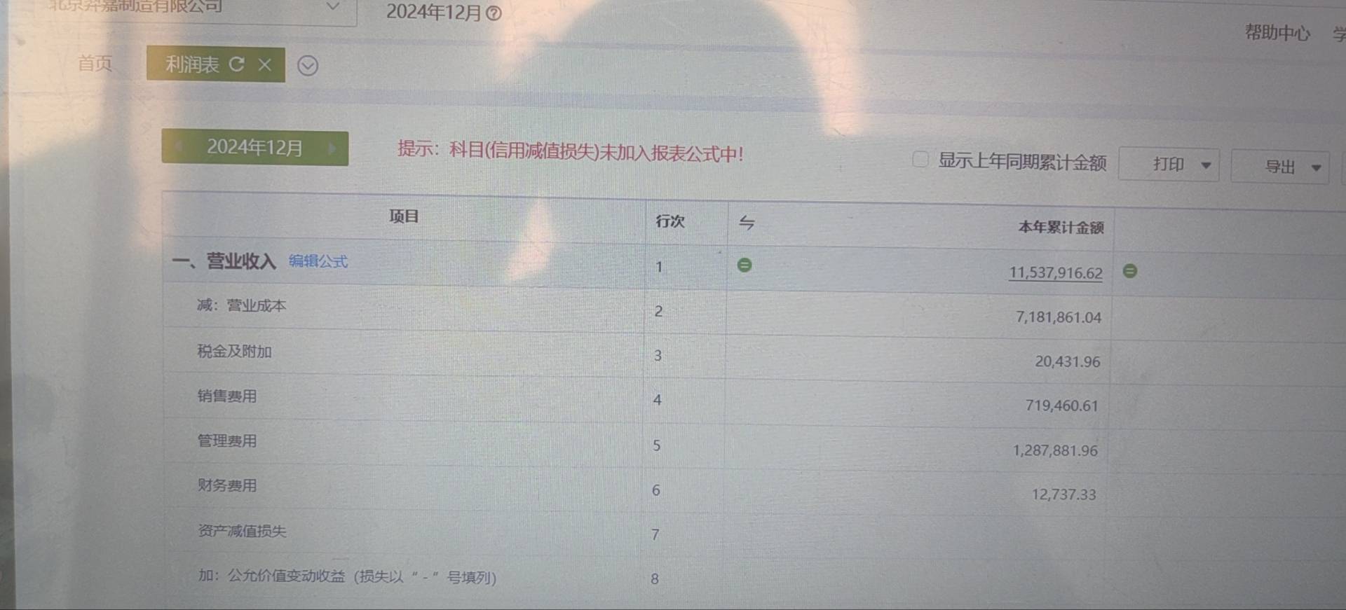 在利润表中,信用减值损失应作为“资产减值损失”项目下的明细项。你需在“资产减值损失”行(第7行)下方新增一行,输入“信用减值损失”,并设置对应公式链接到该科目余额。若系统不支持直接添加,可在“资产减值损失”行中合并计入。注意:确保该科目已正确勾选至报表公式中,否则会提示未加入。