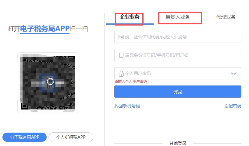 如果老板给你的是企业账号信息(如统一社会信用代码),你应该点击 企业业务 登录。 如果是个人身份登录(如用身份证或手机号),则选择 自然人业务。 通常公司财务人员使用企业业务,个人办税用自然人业务。