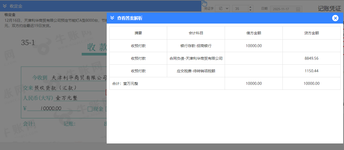 收定金 12月16日,天津利华商贸有限公司预定节能灯A型8000台,节能灯B型7000台,景观灯C型3000台,已签订合同,收取预收款10,000.00元,双方约定最迟19日发货。 这里的分录为什么要价税分离,还有多写"应交税费-待转销项税额‘’。 为什么有的题目预收账款直接就是合同负债,为什么有的还要价税分离?