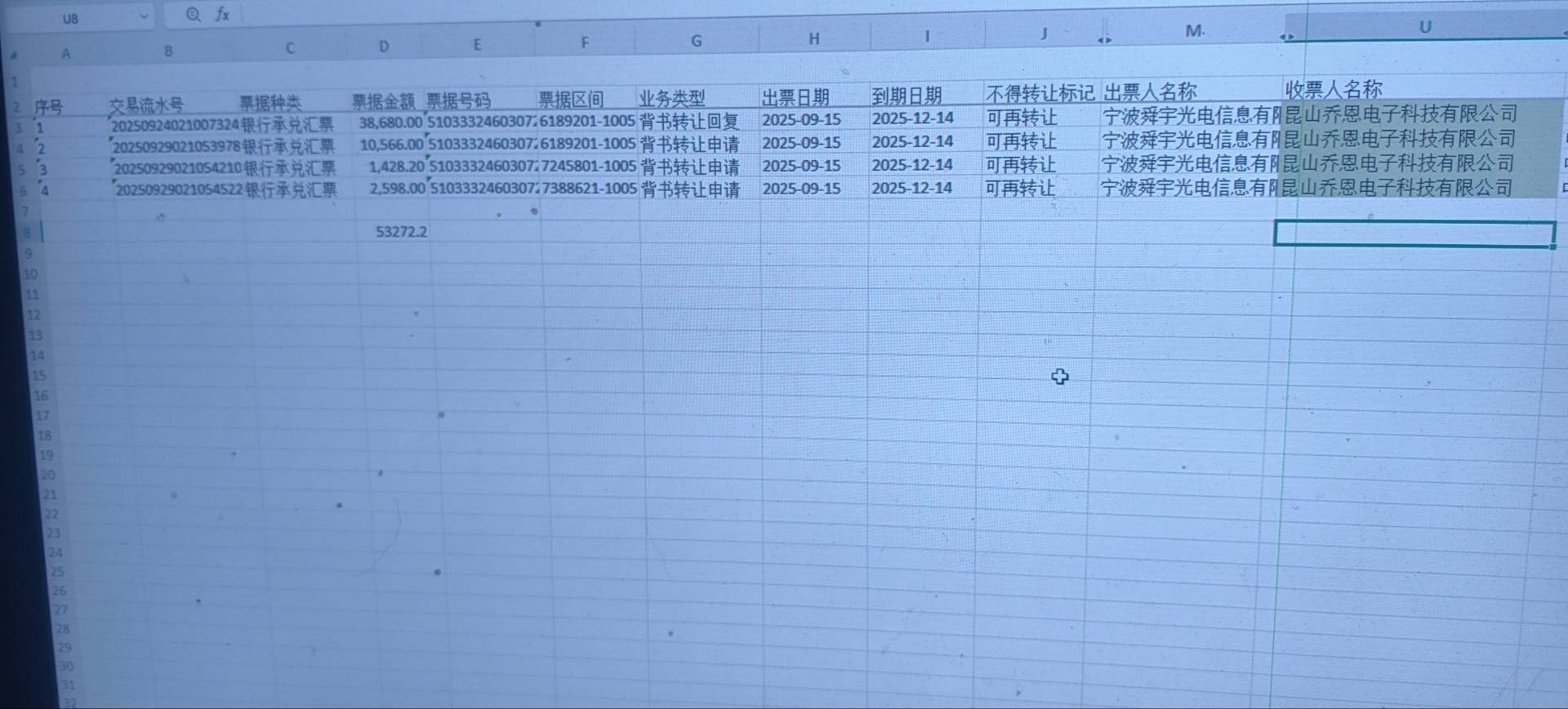绿色区域显示的是你公司作为收款人收到的银行承兑汇票信息,这些数据是从你们公司银行账户导出的票据明细,所以收票人名称是你公司的客户(如“昆山乔恩电子科技有限公司”),而不是你公司。