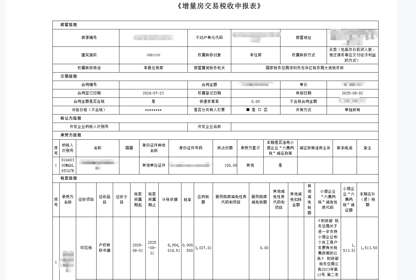 该《增量房交易税收申报表》涉及的税款(如印花税、契税)属于企业购买非住房房产产生的税费,应计入相关资产成本。