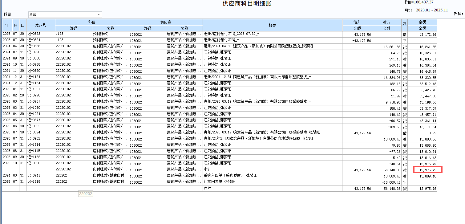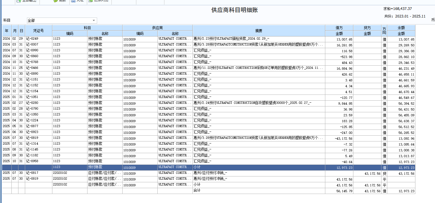 - 将“ULTRAPAST CONSTR.”(1010009)的预付款、汇兑损益等全部转到“建筑产品(新加坡)”(1030021)下。