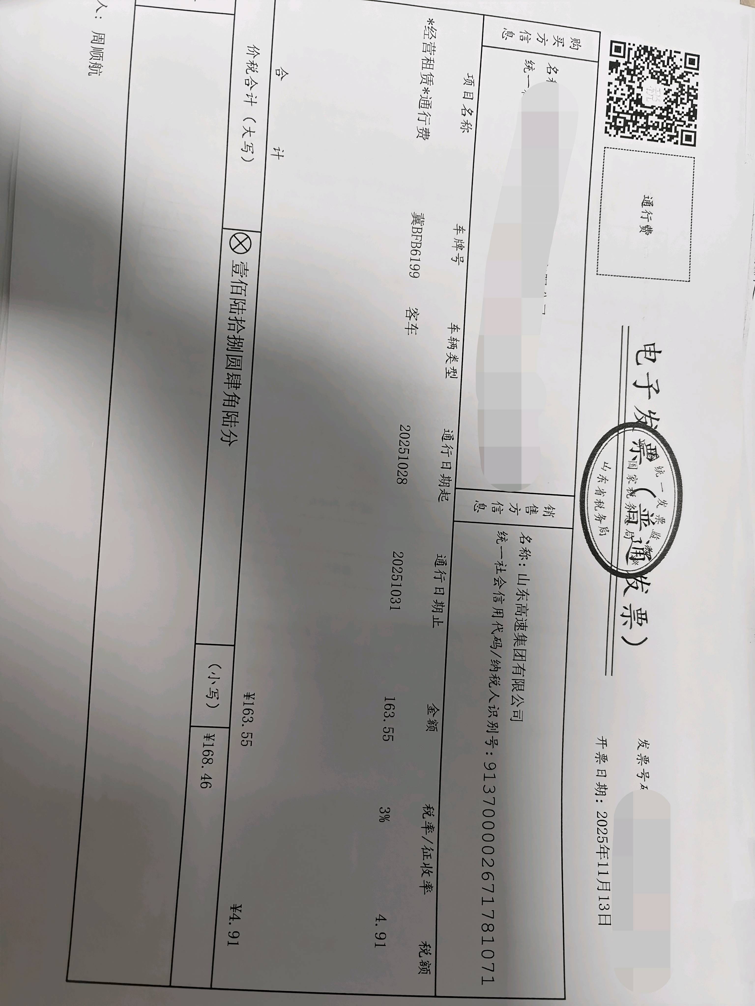 该发票为山东高速集团开具,注明了税率3%和税额4.91元,符合抵扣条件。
