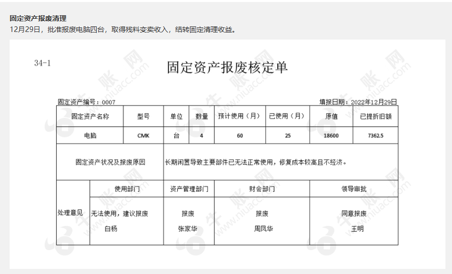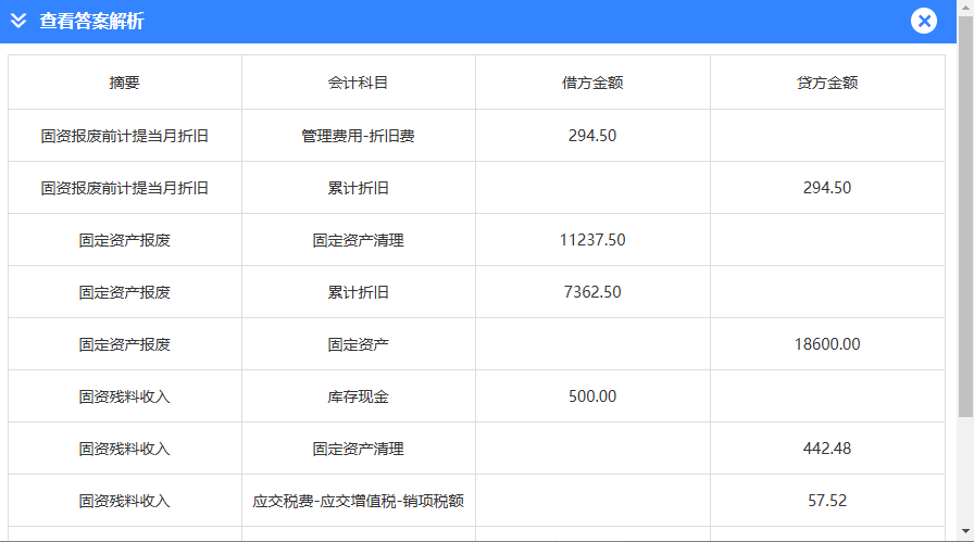 是对的,但图 4 的 “已提折旧额 7362.5 元” 已经包含了 12 月的折旧,因此在 “报废转入清理” 的分录中,直接使用 “累计折旧 7362.5” 即可,不需要再额外加 12 月的折旧(否则会重复计算)。