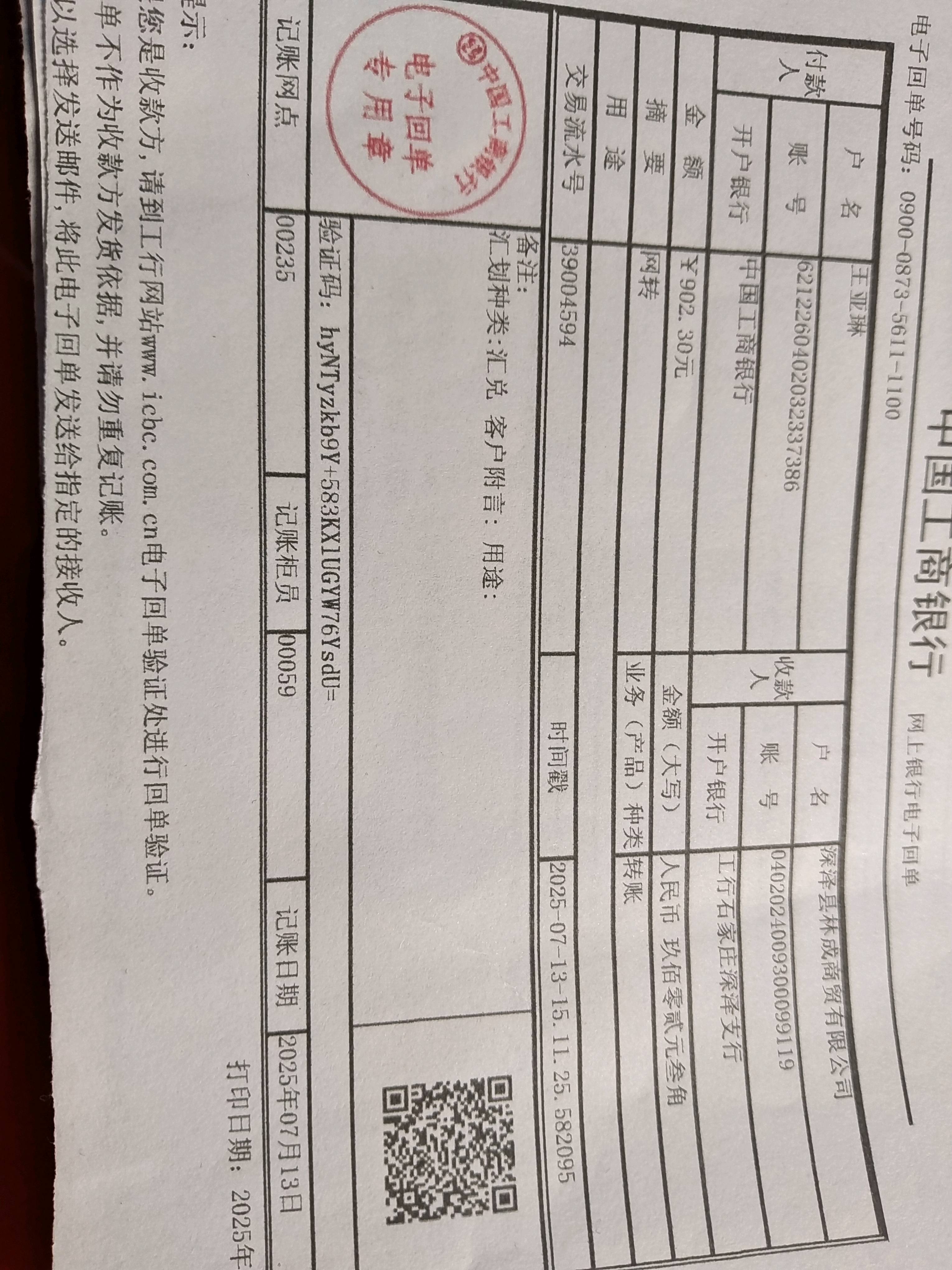 根据电子回单内容,该笔业务为银行转账支付902.30元,用途为“网转”,收款方为深泽县林成商贸有限公司。