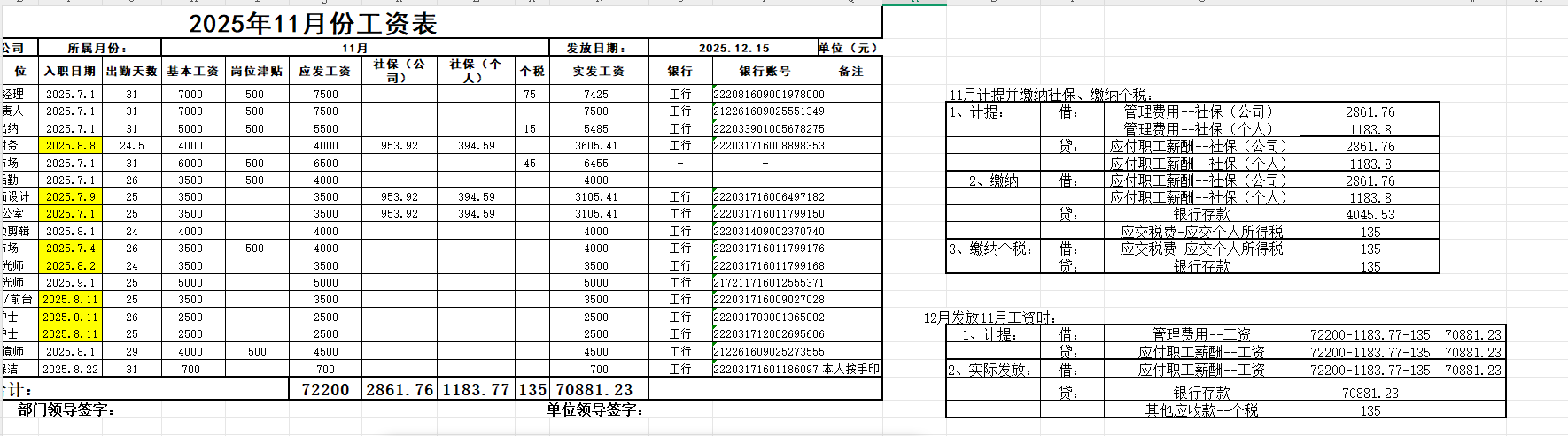 工资发放、计提社保及个税的会计分录基本正确,但需注意以下几点: