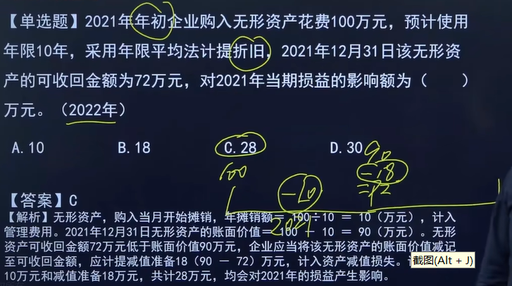 同学您好!这个题目是资产减值的题目,无形资产当月购入当月计提摊销摊销影响金额100/10=10万,2021年底账面价值是100-10=90万,可回收金额为72万,减值金额90-72=18万,所以影响损益的金额是10+18=28万元
