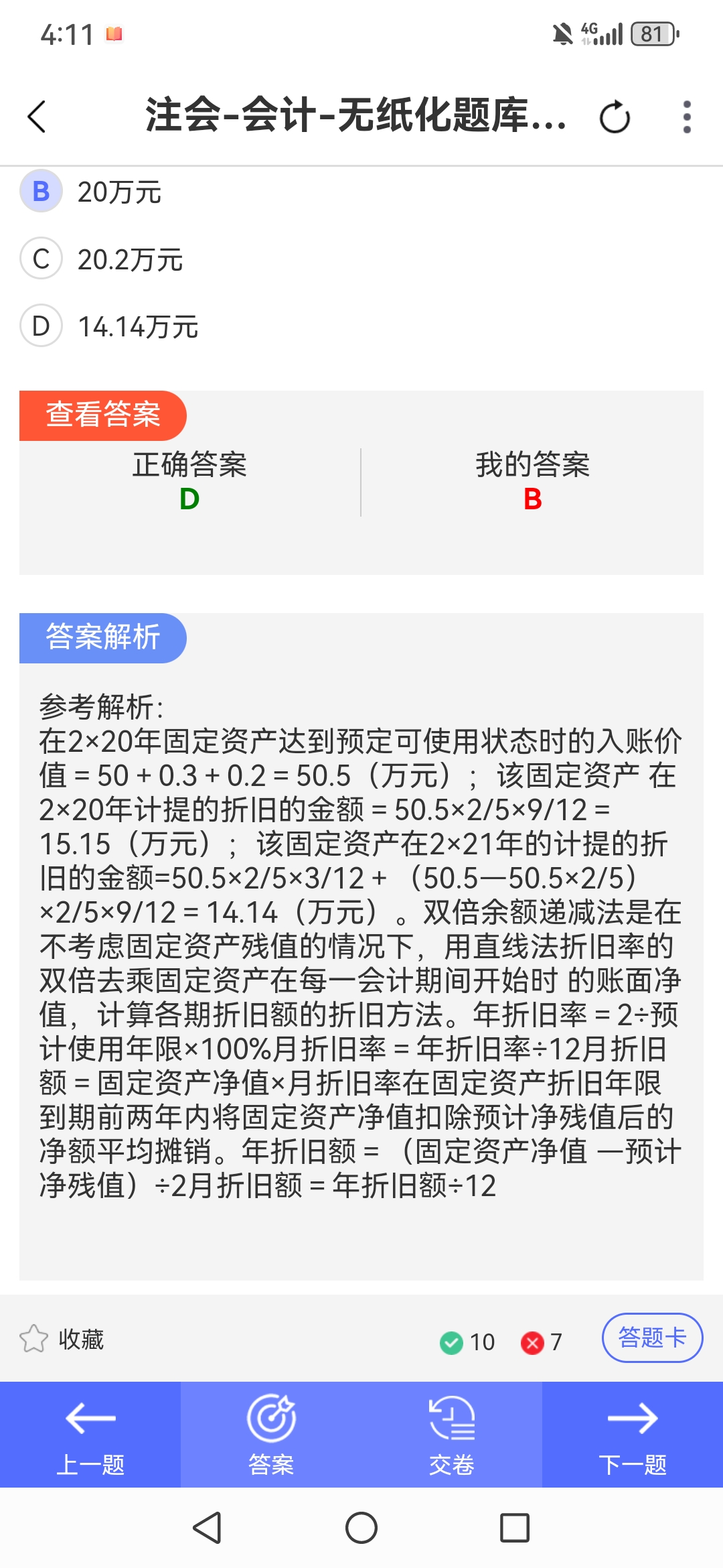 为什么这题的21年折旧要分开算?双倍余额递减法不是最后两年才改成直线法吗?从20年开始算21年才是第2年,所以我感觉这题应该是50.5×2/5=20.2,应该是C吧。