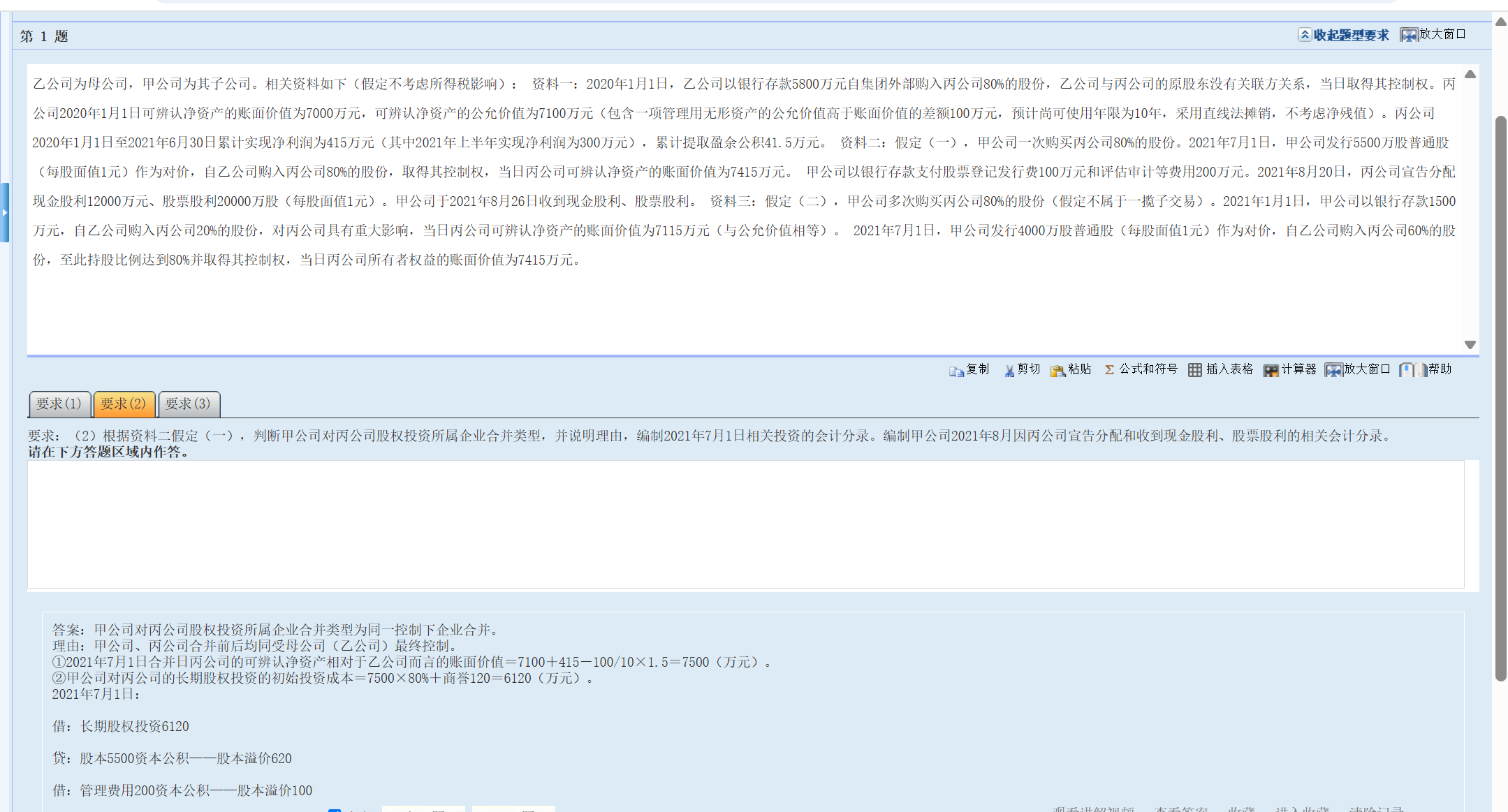 - 计算甲公司对丙公司的初始投资成本:初始投资成本 = 丙公司相对于最终控制方而言的可辨认净资产账面价值×持股比例 + 商誉,乙公司取得丙公司时商誉 = 5800 - 7100×80\% = 120万元,所以甲公司初始投资成本 = 7500×80\% + 120 = 6120万元。