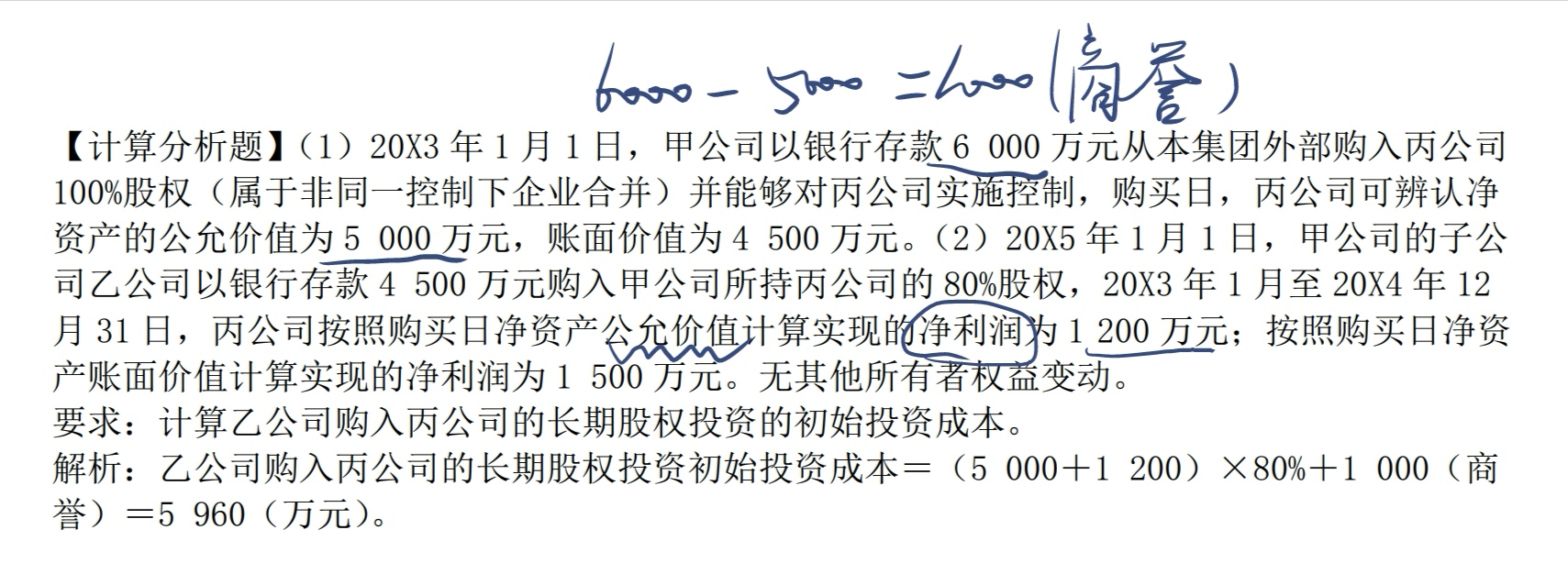 - 当乙从甲处取得丙80%股权时,虽然乙和丙同属甲控制,属于同一控制下企业合并,但乙取得丙的控制权是基于甲之前对丙的控制,所以乙在确认对丙的长期股权投资初始投资成本时,要以丙在甲合并财务报表中的账面价值为基础计算,这个账面价值中就包含了甲合并丙时形成的商誉。
