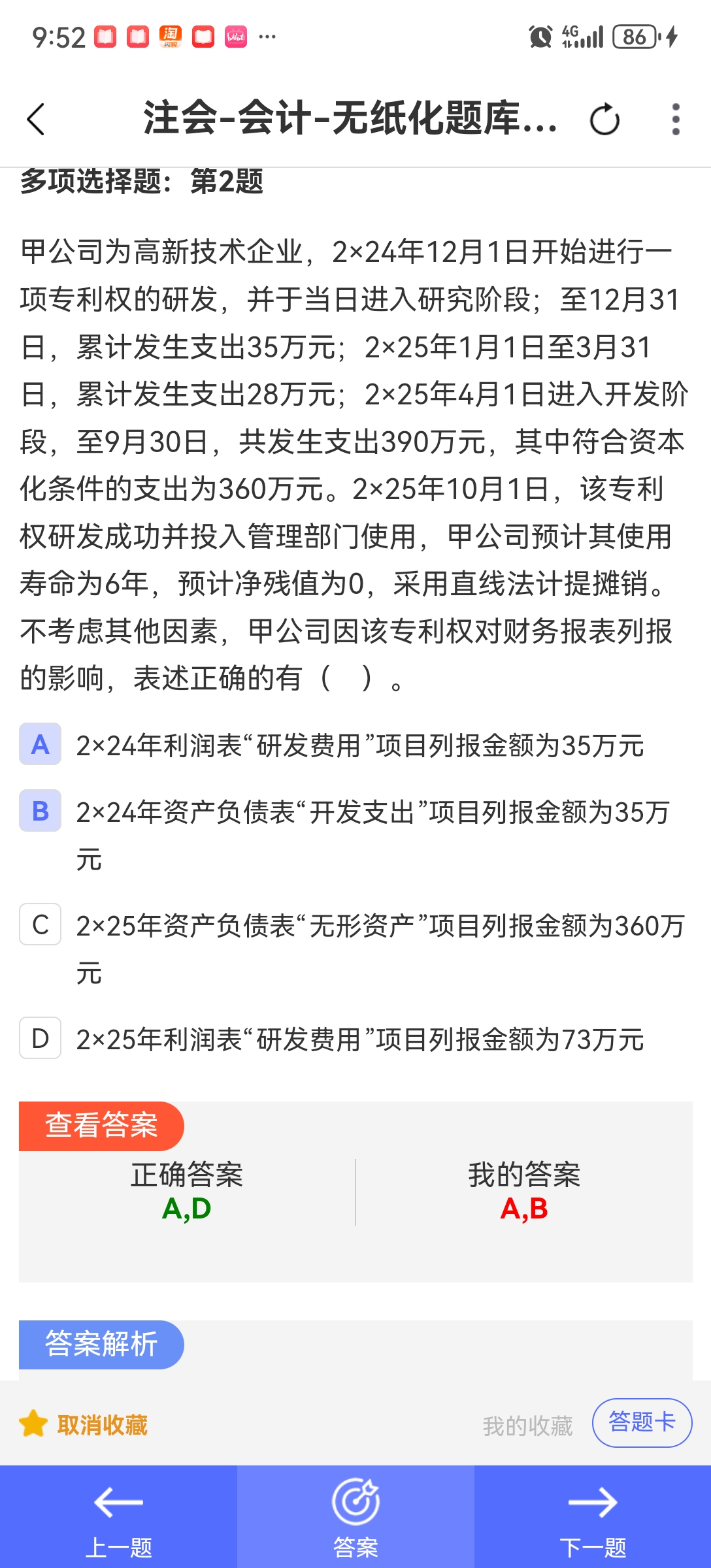 因此,2×25 年摊销额 15 万需计入研发费用,最终研发费用总额 73 万(D 正确 )