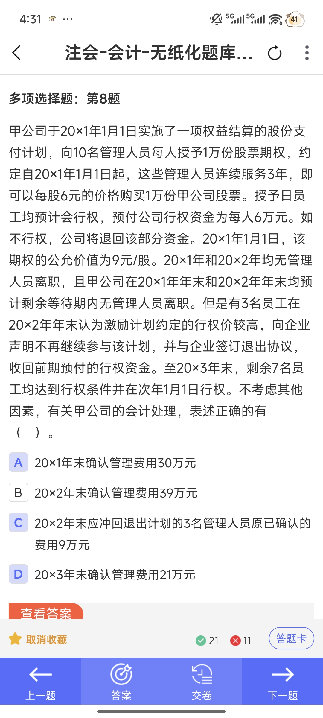 你好,- 在权益结算的股份支付中,当员工主动声明不再参与计划等导致其不满足行权条件时,从会计处理角度看,相当于该部分权益工具的等待期提前结束 。因为企业不再有理由认为这些员工在未来期间会为企业带来基于股份支付所期望的服务,所以对于这部分不再满足行权条件的员工相关的股份支付,要进行加速可行权处理。即把原本应在剩余等待期内确认的费用,在其声明退出的当期提前确认(同时冲回之前已确认的部分,因为之前是基于预计可行权进行的确认,现在情况改变),以准确反映企业因股份支付而承担的成本费用。