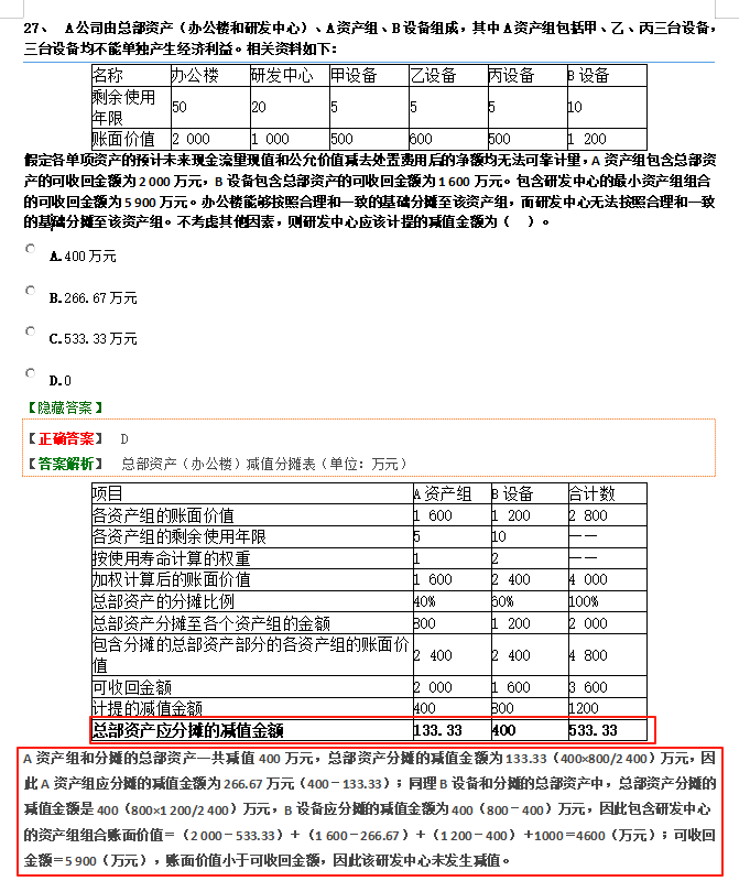 总部资产减值分摊,是因为它得和资产组一起算减值,按资产组(含分摊总部资产后)的账面占比分摊,保证减值合理归到各资产组; 包含研发中心的组合账面,是把各部分(总部资产、A、B、研发中心)减值后的数据汇总,看整体账面; “最小资产组组合可收回金额” ,就是研发中心必须绑定的 “最小资产组合” 能收回的钱,用来和组合账面比,判断减值 。 (研发中心账面 1000,组合账面 4600 < 可收回 5900,所以研发中心没减值,选 D )