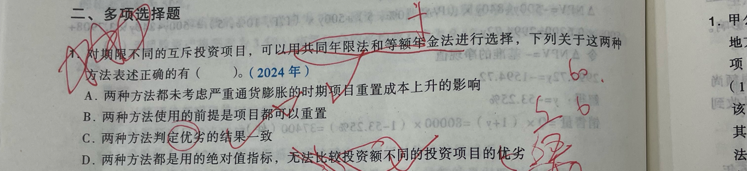 等额年金法:计算项目等额年金,选年金高的;若项目可重置,等额年金法本质与共同年限法逻辑相通(按共同年限重置后,净现值总额 = 等额年金 × 年金现值系数,年金高则总额高 )。