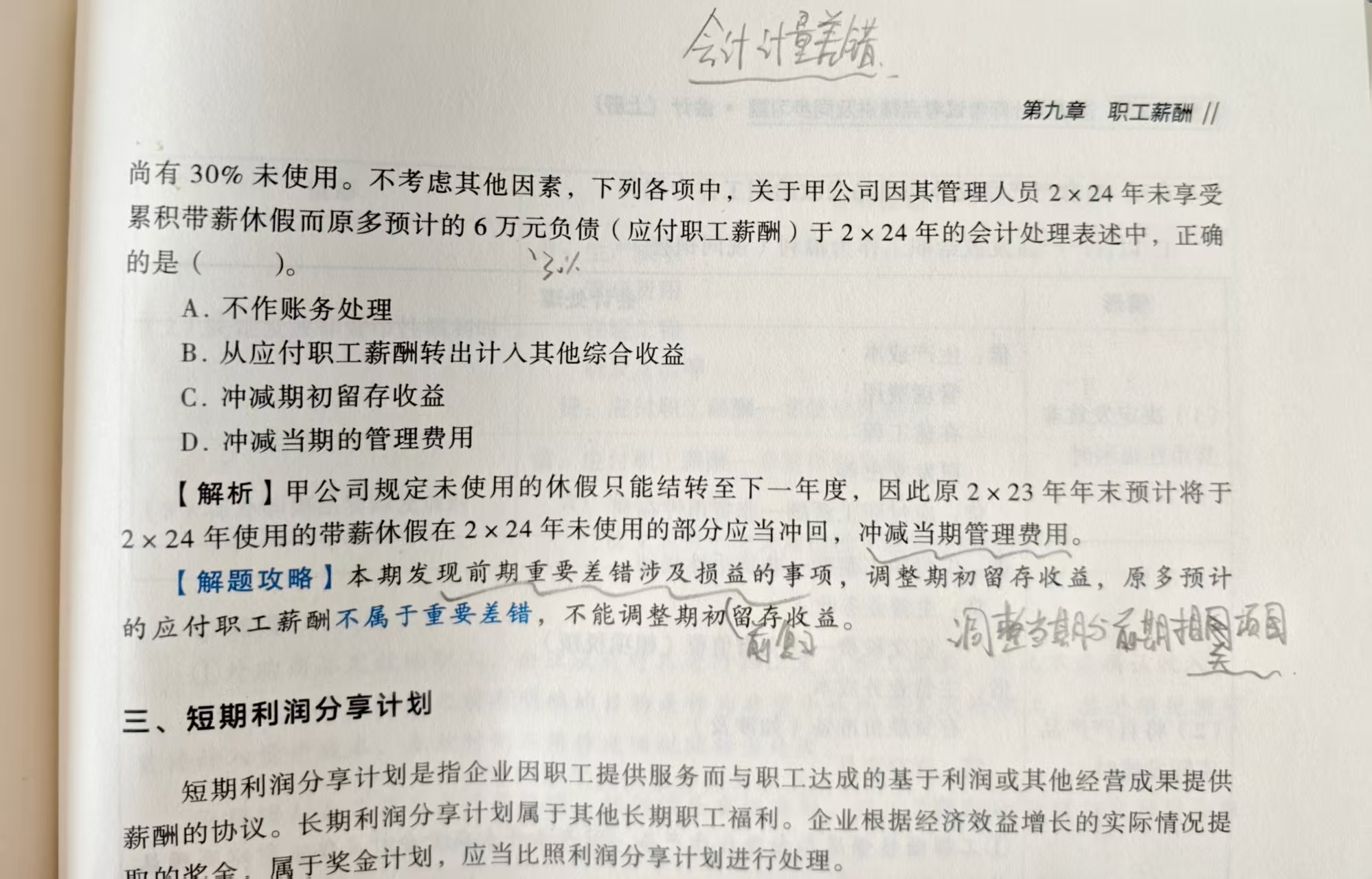 这一题 之所以冲减当期管理费用是不是因为提到的“非重大差错”对应“需要调整当期与前期相关项目”,而题目中提及的是“管理人员的累计带薪休假”,对应“管理费用”。这么个逻辑所以是冲减当期管理费用了