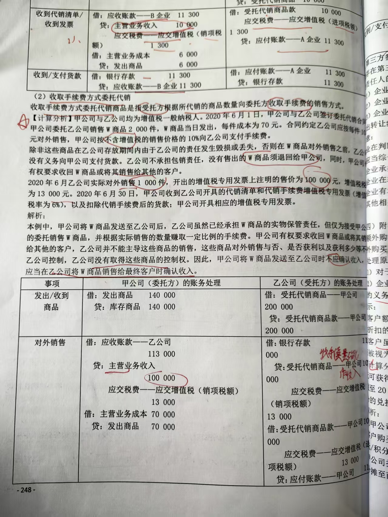 2. 甲公司按不含税销售额的10%收取代销手续费,即100,000元 10% = 10,000元。