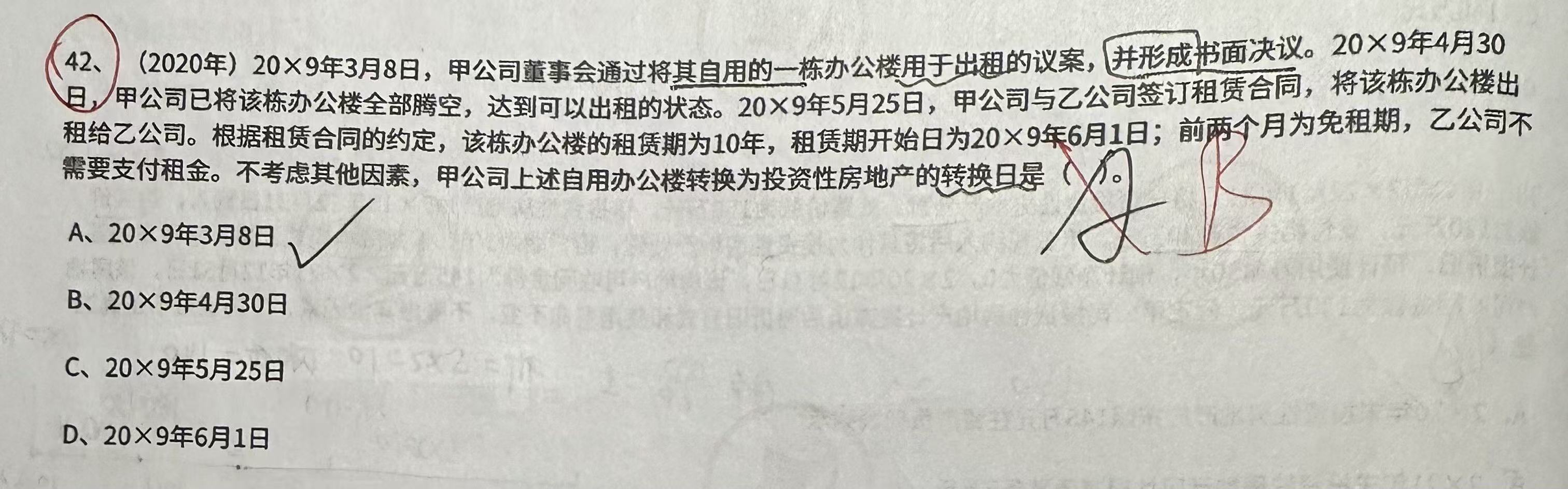 - 20×9年3月8日:仅通过将办公楼用于出租的议案并形成书面决议,此时办公楼仍处于自用状态,未实际具备出租的条件,所以不是转换日。