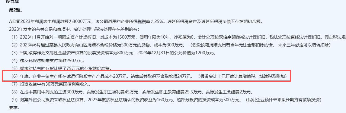 企业生产线在试运行阶段生产的产品,会计上通常不确认收入和成本(因为尚未正式投产),但这些产品已销售并产生不含税收入24万元、成本20万元。会计上可能将这部分收入计入“其他收益”或“营业外收入”,而成本仍计入存货或费用。
