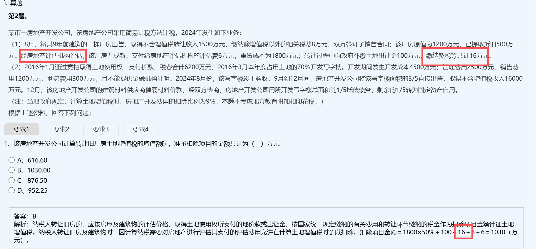 你的问题很关键,核心在于契税是否重复扣除。 在土地增值税中,转让旧房采用评估法时,房屋的评估价格已包含契税,因此契税不应再作为“与转让有关的税金”单独扣除。 但本题解析中将契税16万元单独计入扣除项目,这是错误的。正确做法是: - 评估价 = 重置成本 × 成新率 = 1800 × 50% = 900万元(此价已含原契税) - 可扣除项目 = 评估价 + 土地出让金 + 评估费 = 900 + 100 + 6 = 1006万元 而答案中却加了16万契税,导致多算,应为错误。 ✅ 正确答案应为:1006万元,但选项无此数,说明题目或解析有误。 ⚠️ 结论:契税不能重复扣除,若评估价已含,则不能再加。