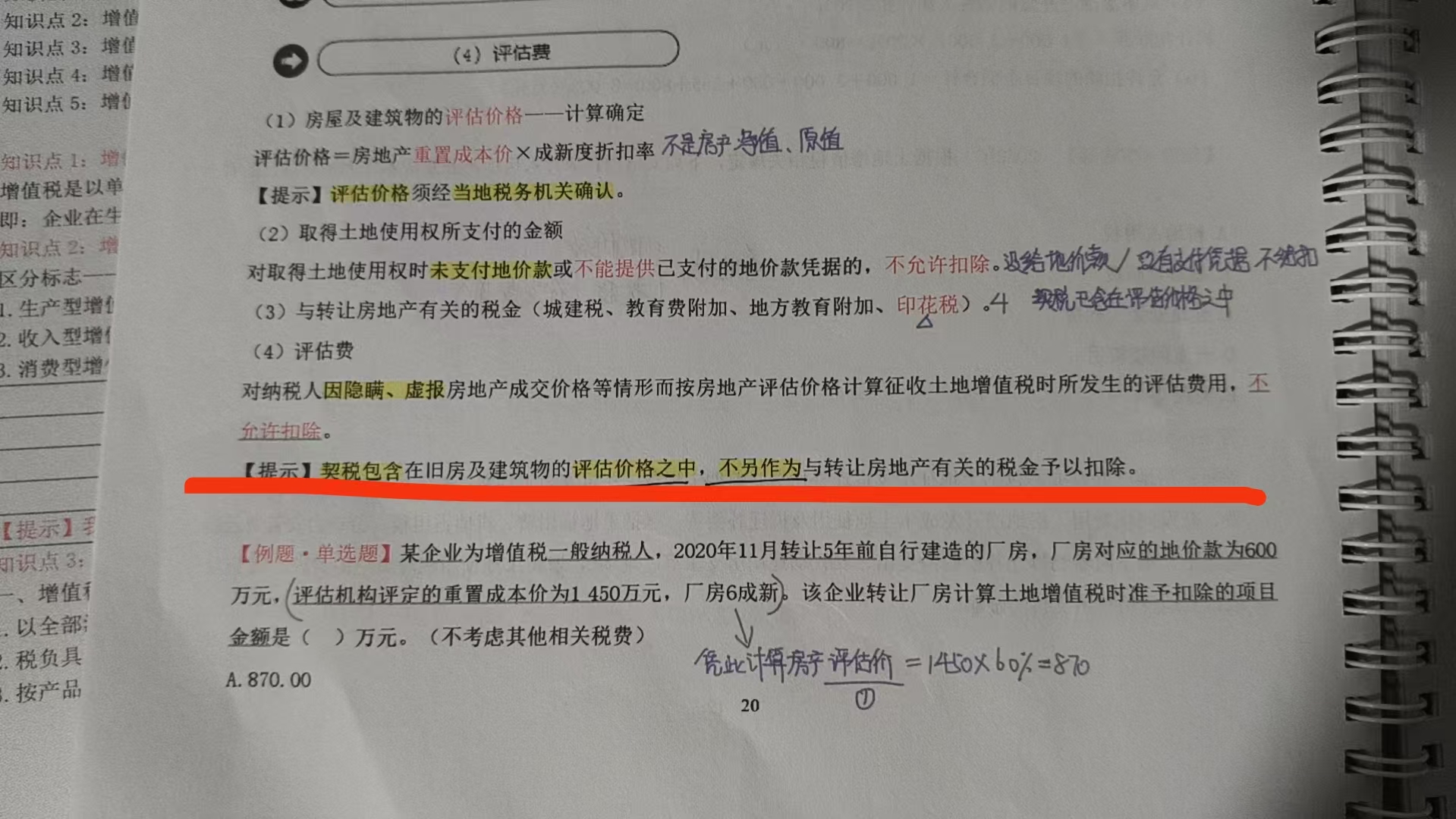 老师您好,土地增值税中转让旧房及建筑物的扣除项目使用评估法,...