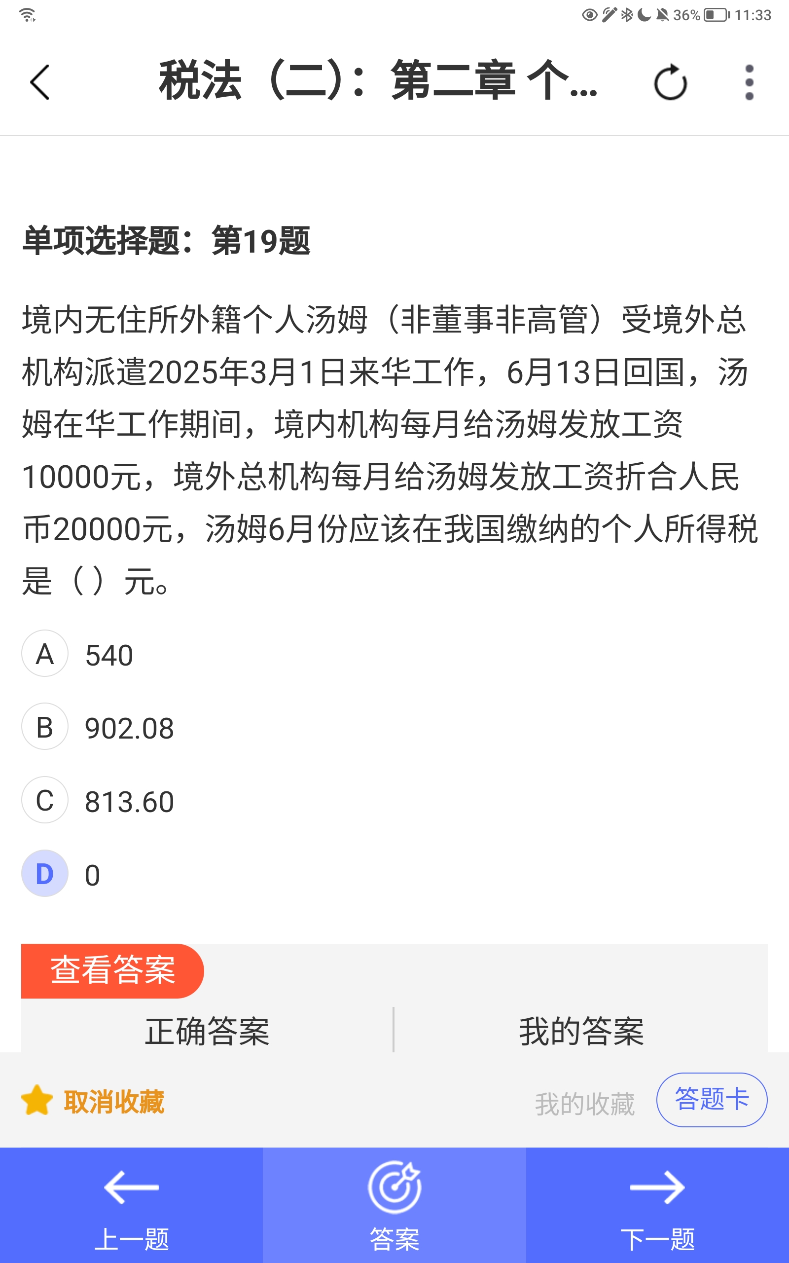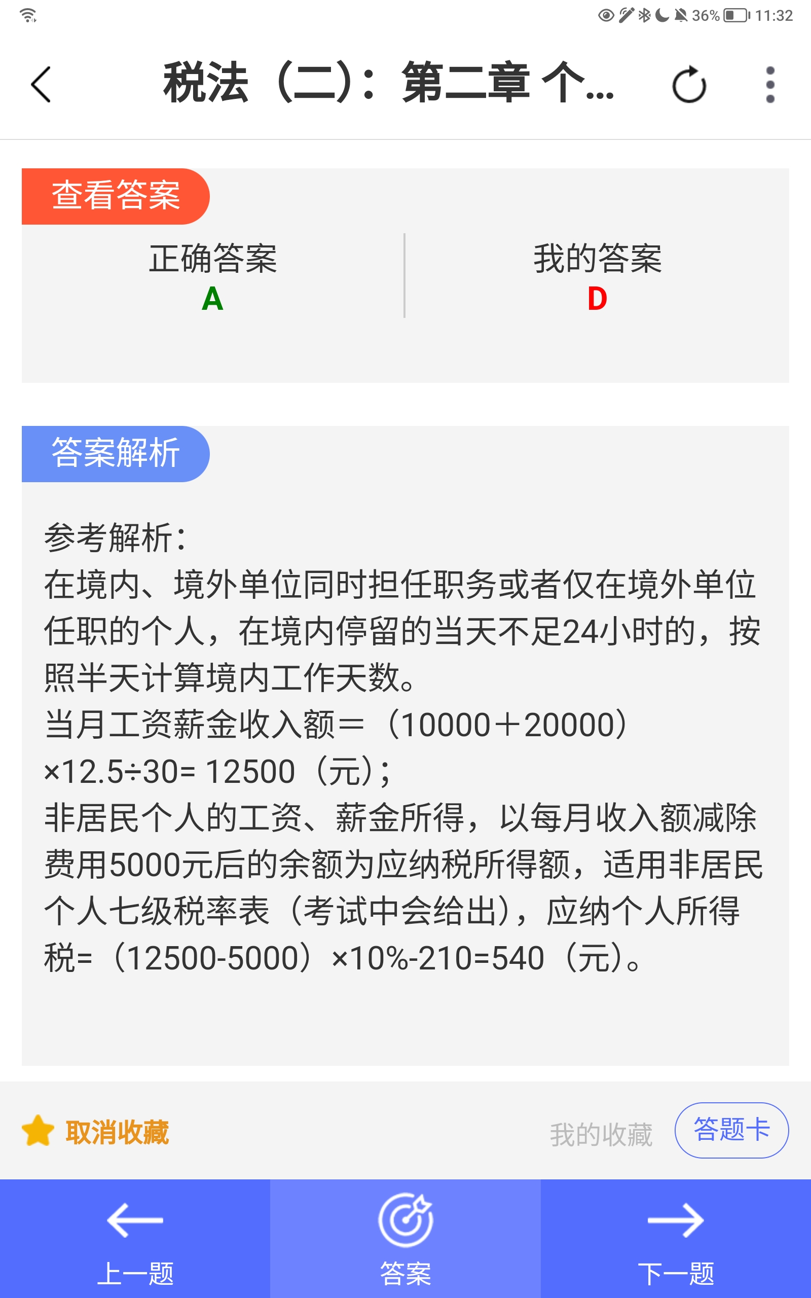 - 正确计算:收入按比例,减除5000后查表,结果为 540元 → A 正确。