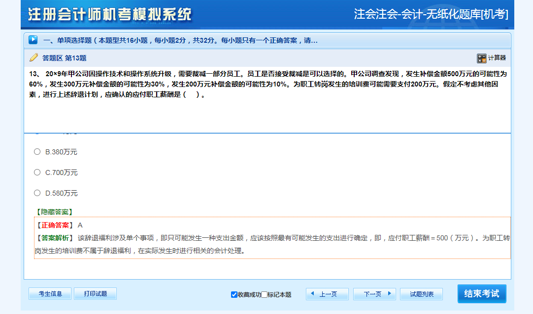 在或有事项中,预计负债的确认应以最可能发生金额为基础,而不是加权平均。本题属于“辞退福利”中的单个事项,且只可能支付一种补偿金额,因此应选择最有可能发生的金额(即概率最高的500万元)作为应付职工薪酬。