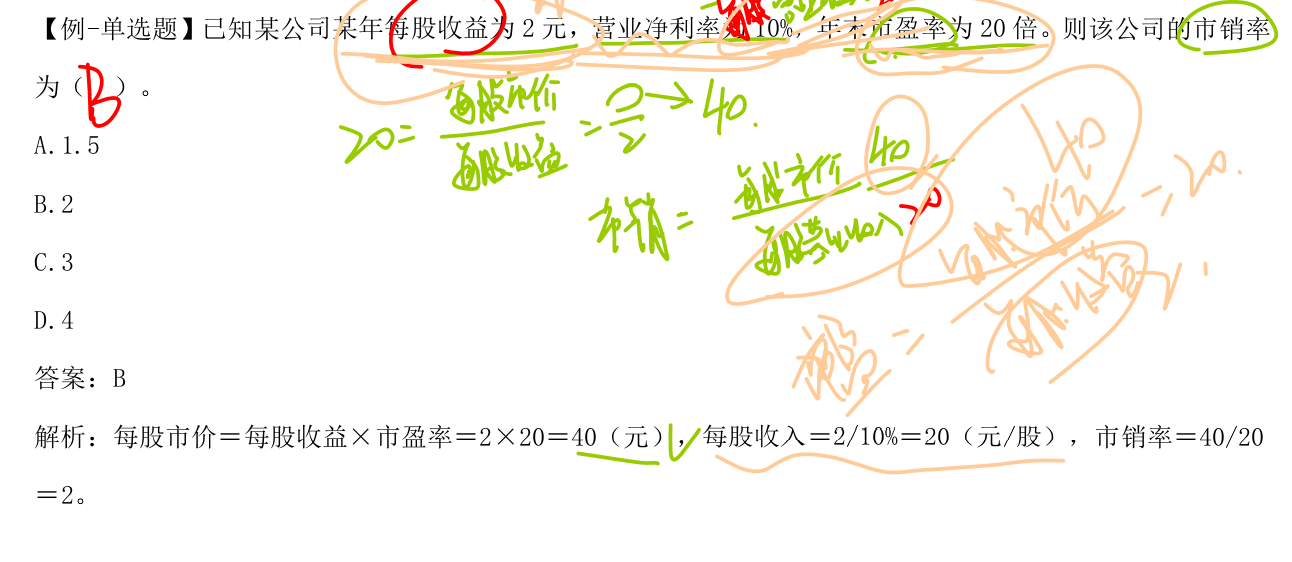 然后市销率 = 市价 / 每股收入 = 40 / 20 = 2。✅