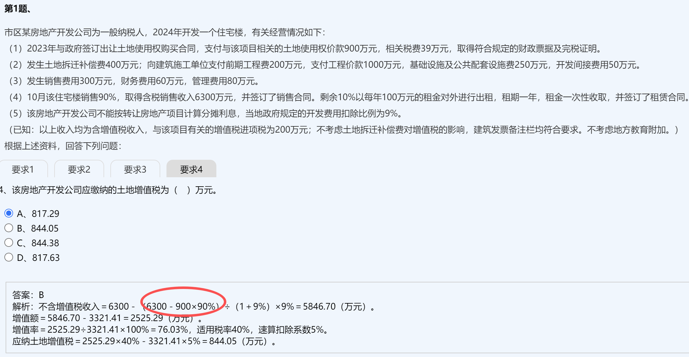 但更准确地说,900万元土地成本是在计算“扣除项目”时单独列示的,不能在收入中重复扣除。所以该解析中存在逻辑问题——不应在收入中减去土地成本。