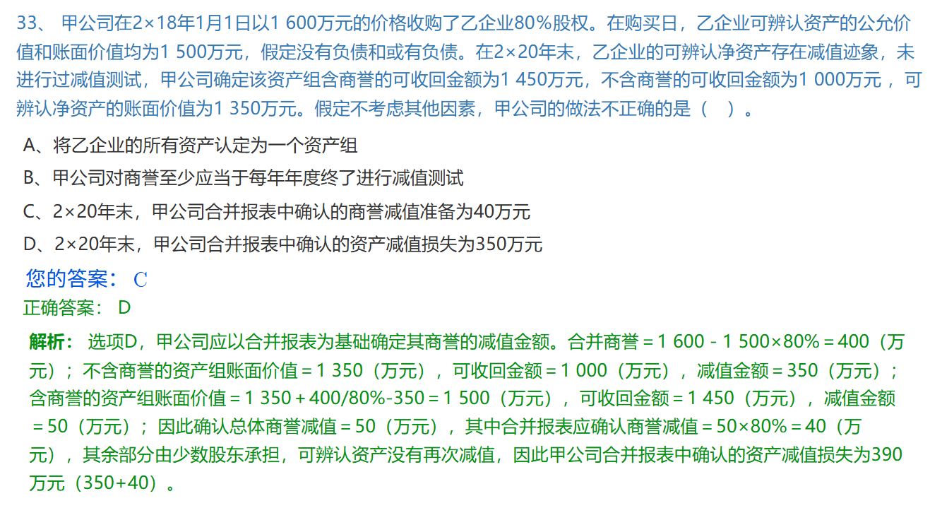 - 含全部商誉的资产组账面价值计算:不含商誉的资产组账面价值(子公司可辨认净资产账面价值) + 全部商誉(合并商誉 + 少数股东享有的商誉) - 已确认的不含商誉资产组减值。本题中,不含商誉资产组账面价值1350万,全部商誉500万(合并商誉400万÷80%),已确认不含商誉资产组减值350万,所以含全部商誉的资产组账面价值是 1350 + 500 - 350 = 1500 万。