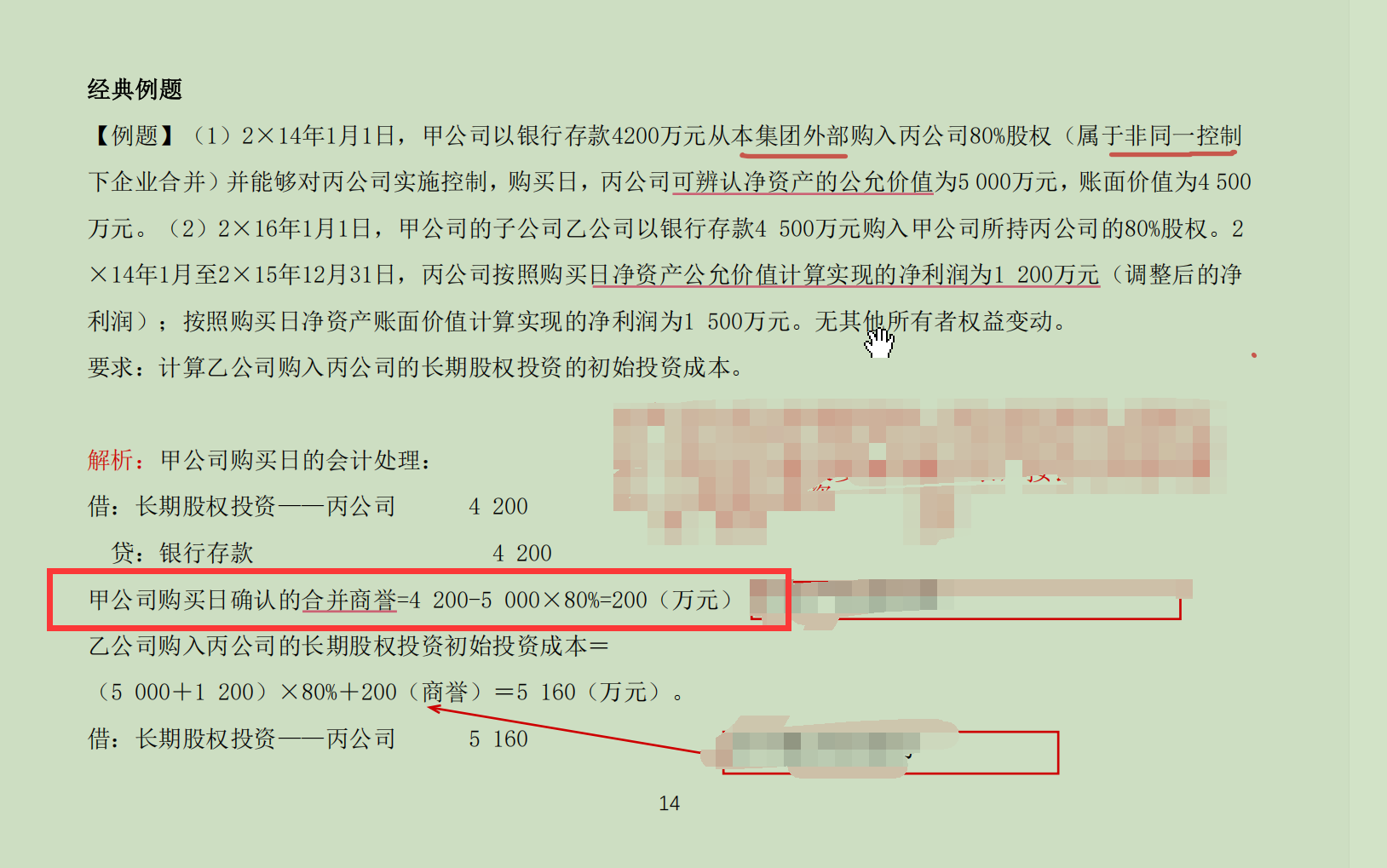 甲公司单体报表里,对丙公司的长期股权投资是按实际支付的成本(4200万元)计量,不会单独确认商誉,只有编制合并报表时,才会计算并列示该笔商誉。