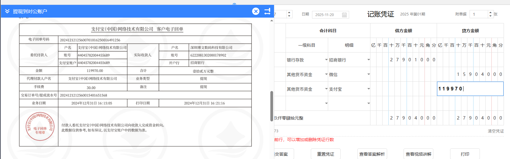 第37题:支付宝提现:支付宝少了12万,银行到账119970,扣手续费...