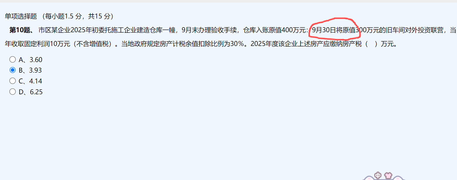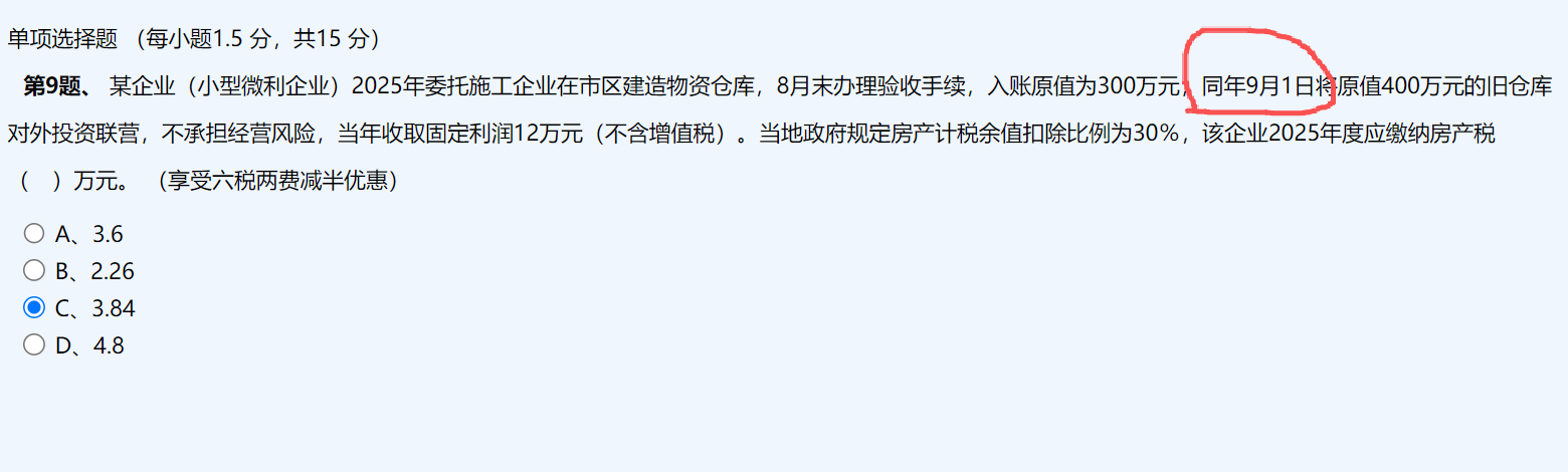 你好,第10题:旧车间:9 月 30 日对外投资,由于纳税义务发生时间为 “当月”,但 30 日接近月末,税务实操中通常认定 9 月仍按从价计征,10 月起才按从租计征。旧车间从价计征的时间为1-9 月,共 9 个月。第 9 题:旧仓库:9 月 1 日对外投资(收取固定利润),从租计征的纳税义务发生时间为合同约定的付款日期当月,即 9 月起开始从租计征,2025 年共涉及4 个月(9-12 月)。旧仓库从价计征的时间为1-8 月,共 8 个月。从租计征:出租、出借房产,自交付出租、出借房产之次月起缴纳房产税。第 9 题中,旧仓库是 9 月 1 日投资,合同约定的收款时间在 9 月,所以从租计征从 9 月开始;第 10 题中,旧车间是 9 月 30 日投资,当月无租金收入,因此 9 月仍按从价计征,10 月起才按从租计征。