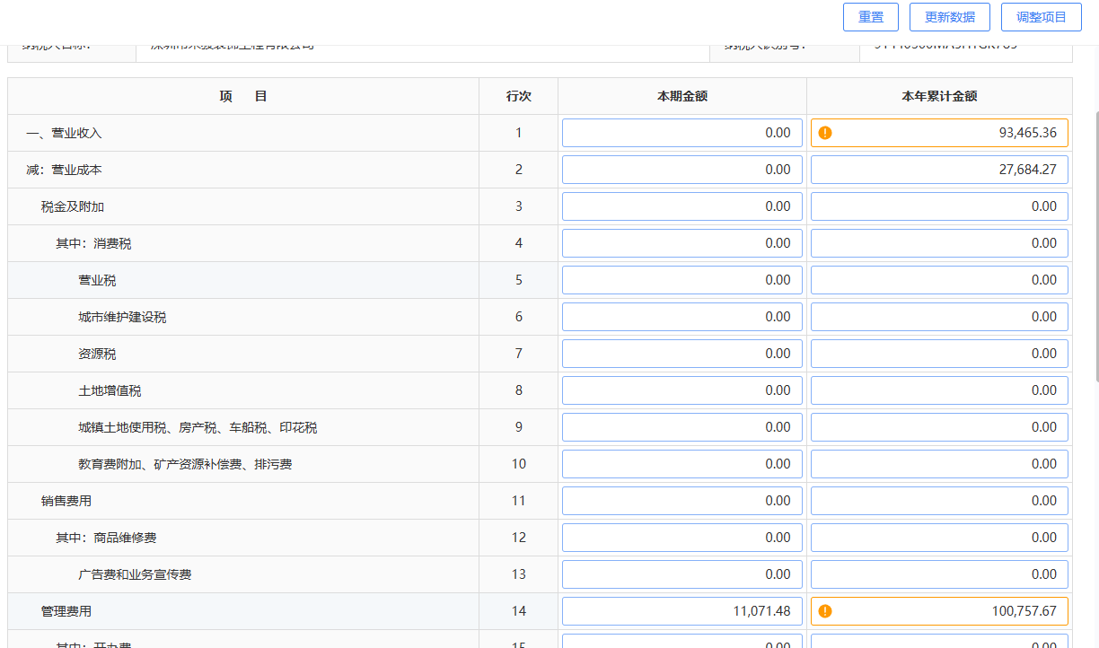 利润表中带黄圆点表示系统提示数据逻辑不一致。