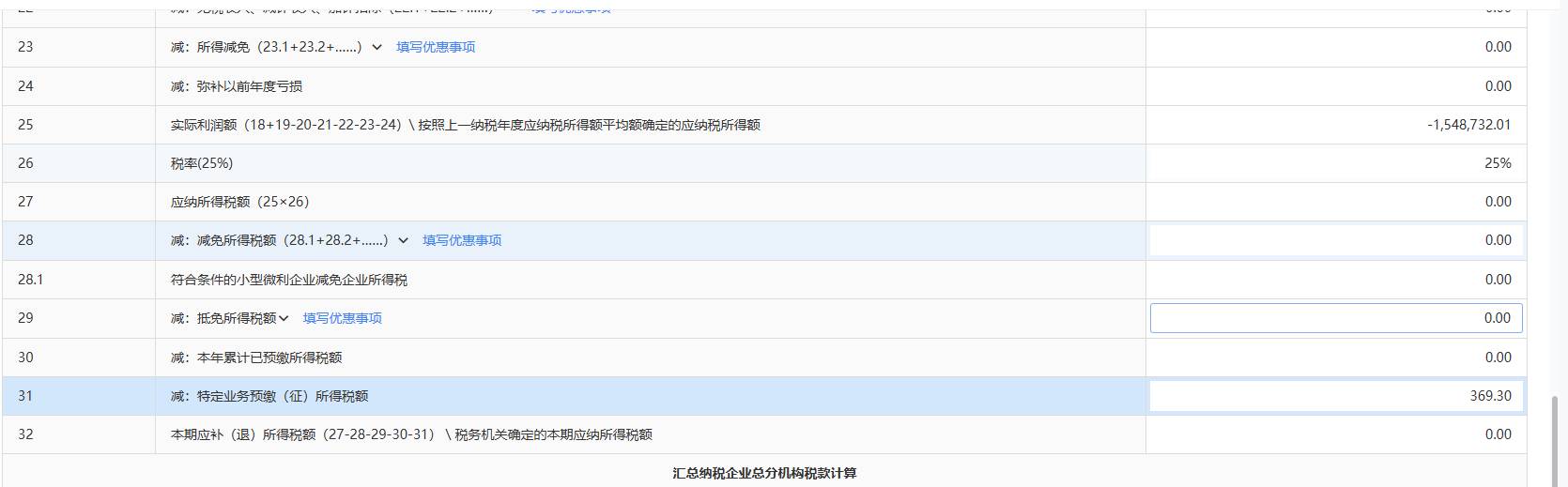 你表格中第30行“本年累计已预缴所得税额”应填写实际预缴金额(如369.30),但因实际利润为负,最终应纳税额为0,多预缴部分可申请退税或抵减以后年度应纳税额。