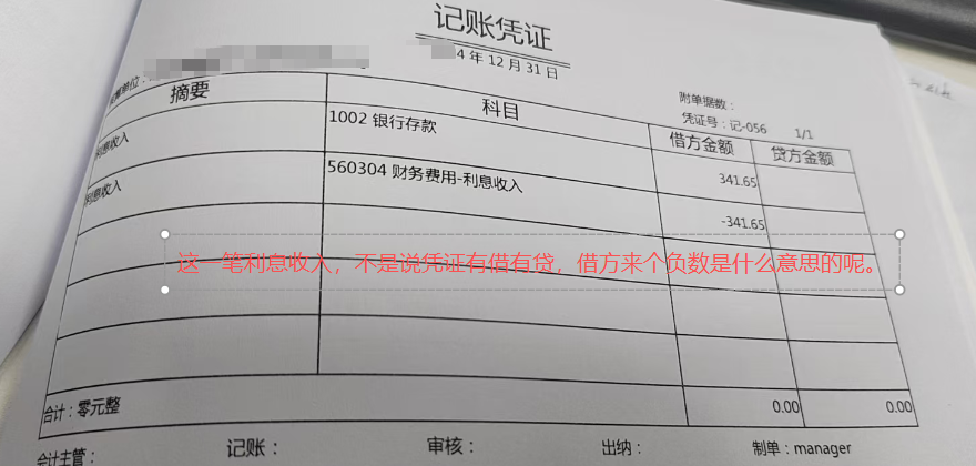 借方出现负数(-341.65),是因为系统或手工录入时,把贷方科目错写在了借方栏。正确做法是:银行存款(借)+341.65,财务费用-利息收入(贷)+341.65。这里负数表示冲减,实际是贷方发生额。