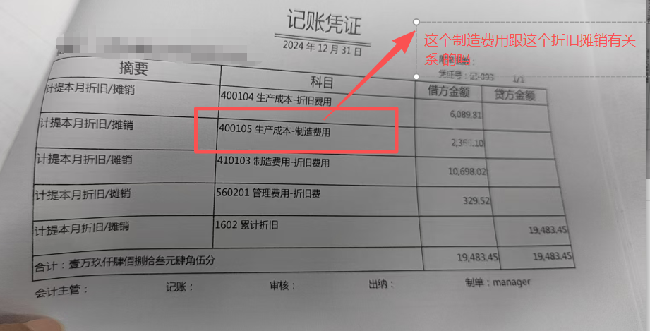 “制造费用”与“折旧摊销”有关。因为企业固定资产用于生产,其折旧应计入制造费用,再分摊到产品成本中。所以借方“生产成本-制造费用”是合理的,代表将折旧费归集到生产成本中。
