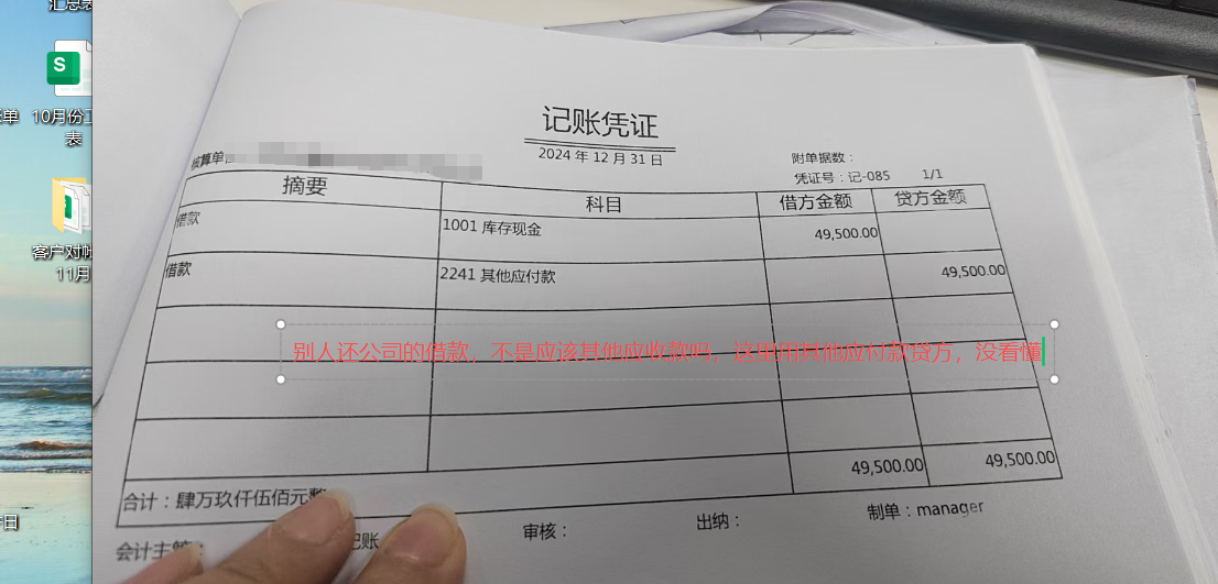 别人还公司钱,本应记“其他应收款”减少(贷方)。但此凭证用“其他应付款”贷方,说明对方之前可能向公司预付或欠款,现在还款冲减负债,属于“往来款清理”。若确实是他人还款,应为“其他应收款”贷方,此处科目有误。