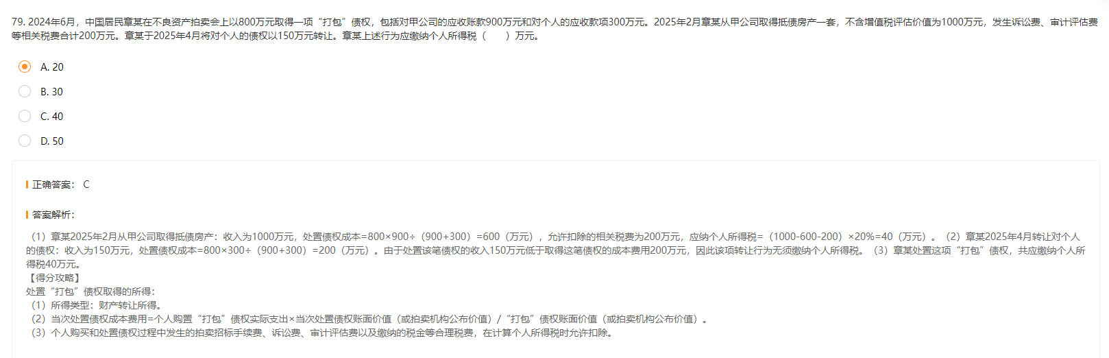 - 转让房产(对应甲公司债权):收入1000万元,成本600万元,相关税费200万元可扣除 → 应税所得 = 1000 - 600 - 200 = 200万元 → 税 = 200 × 20% = 40万元