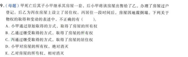- E正确:乙的物权因房屋倒塌而绝对消灭(物灭权灭)。